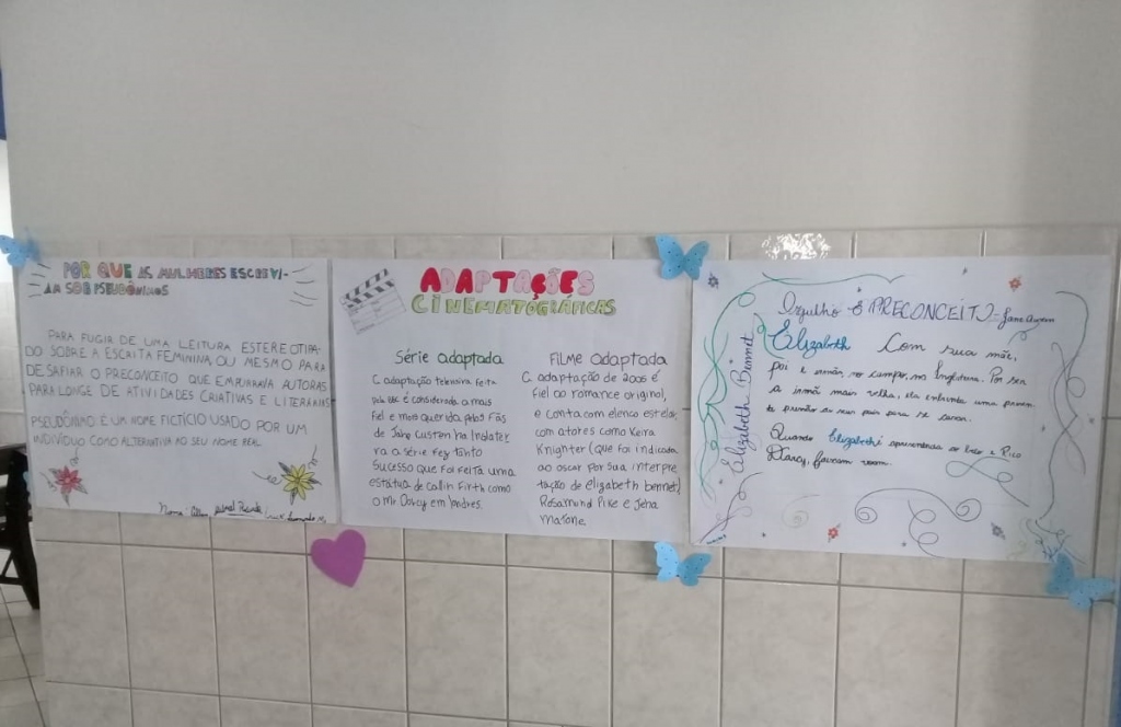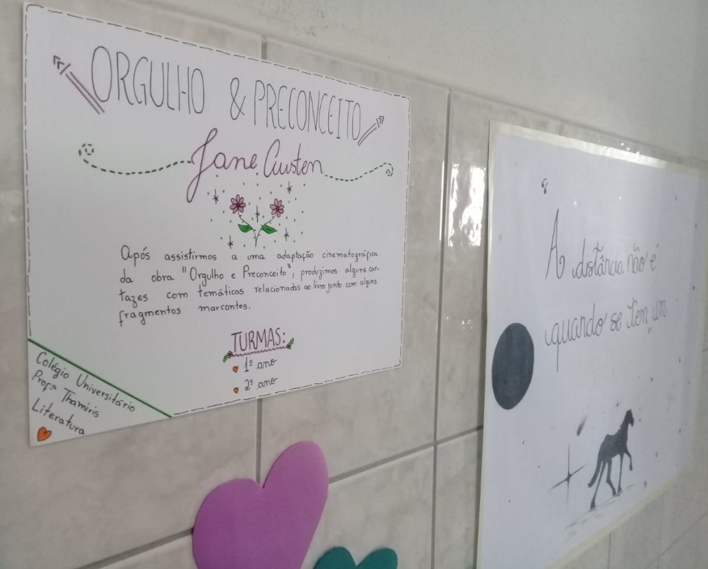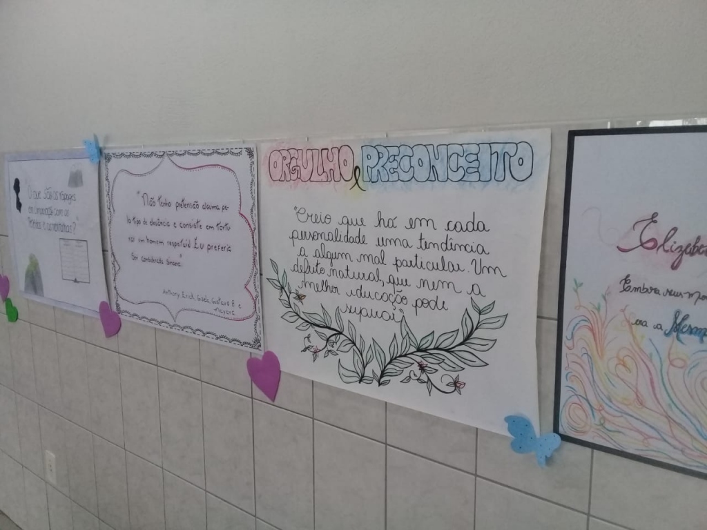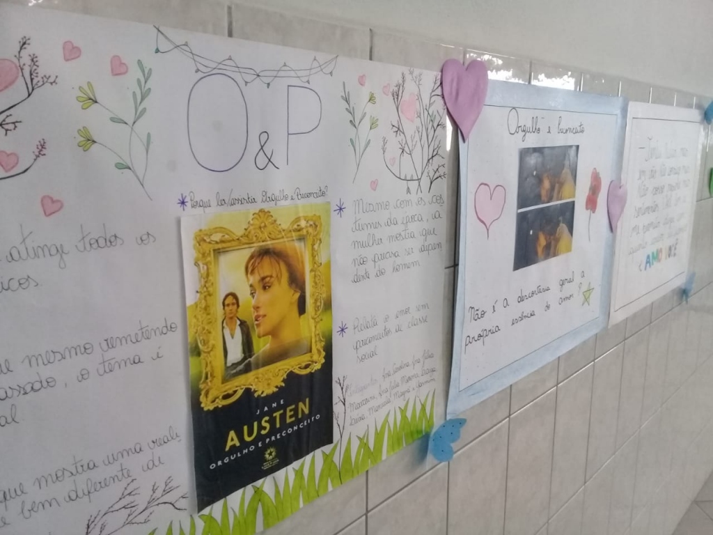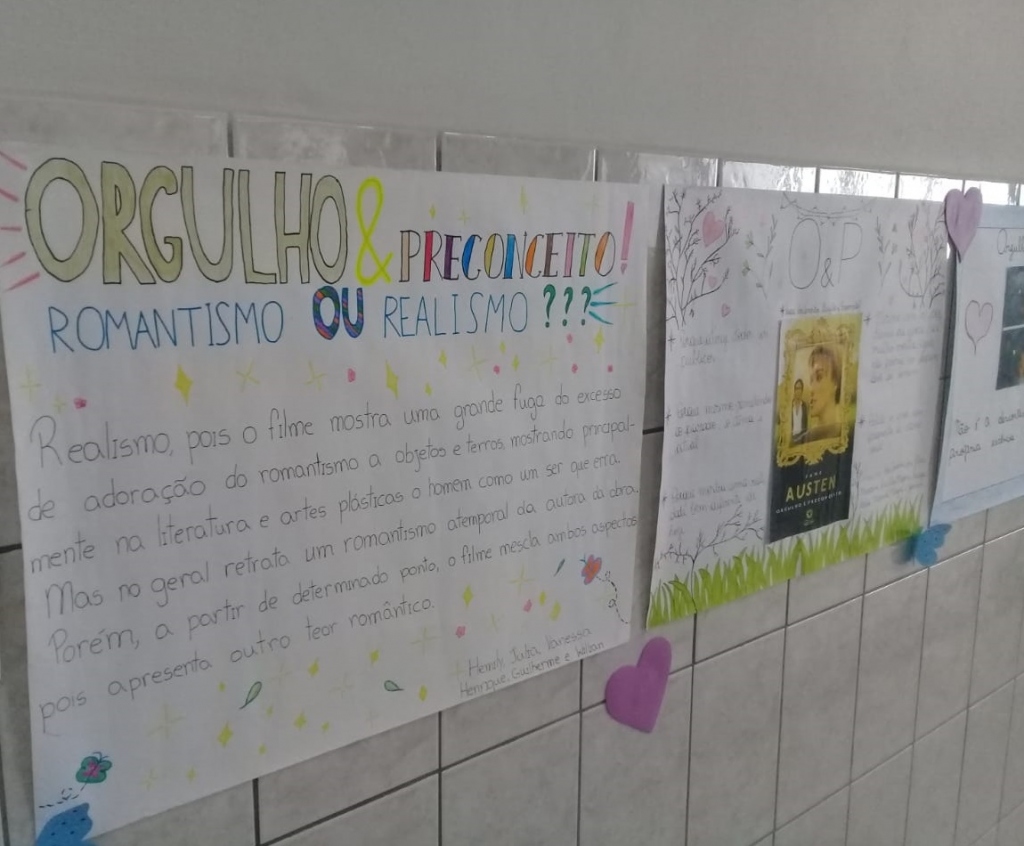 Após a releitura da obra, os alunos orientados pela professora Thamiris, confeccionaram uma série de cartazes sobre os motivos para ler e assistir a obra/quem é Jane Austen?/O&P é uma obra romântica ou realista?/A protagonista marcante Elizabeth Bennet, que agora estão expostos no hall do Colégio.